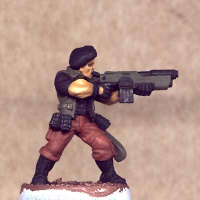 As soon as the skin was finished I applied the main basecolors on the rest of the mini. Those colors are 'Troll Flesh' for vest, gun casing, etc., 'Chestnut Brown' for the pants and 'Dragon Black' for boots, t-shirt, beret, grenades and all metal parts of the gun. |