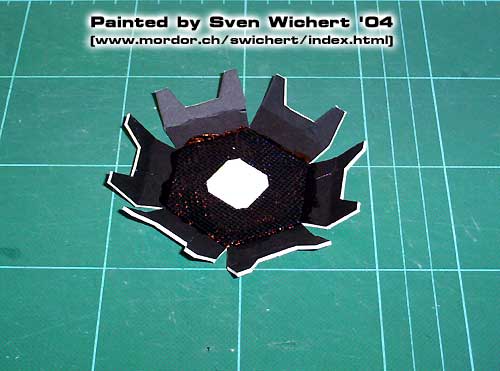 Here you can see all materials that are needed for the basic tower: A base made out of plywood, a piece of mosquito net, two metal sliders from 3.5" floppy discs, pieces of a toothpick and various pieces cut out of cardboard of various thickness (1.2 mm for the white/black stuff, the thin type that e.g. breakfast cereal boxes are made of for the grey pieces). Additionally you will need some tape, white glue, premixed wood-repair putty (or something alike), scissors, a sharp hobby knife, sandpaper, some wooden sticks (e.g. the stuff you get in fast-food restaurants to stir your coffee), basing materials (sand, lichen, static grass, etc.) and some air-drying modelling clay.